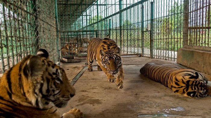 Sejumlah harimau di dalam kandang yang hidupnya tampak tidak tertekan bahkan mencerminkan sebagai hewan yang tampak jinak karena dari sisi kebutuhan pangan sangat tercukupi.