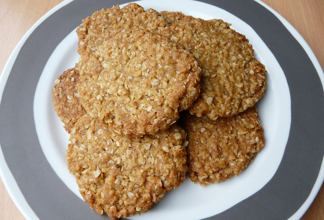 Biskuit anzac terbuat dari gandum, sirup, kelapa, dan bahan lainnya yang membentuk kue (gula, tepung, dan mentega).