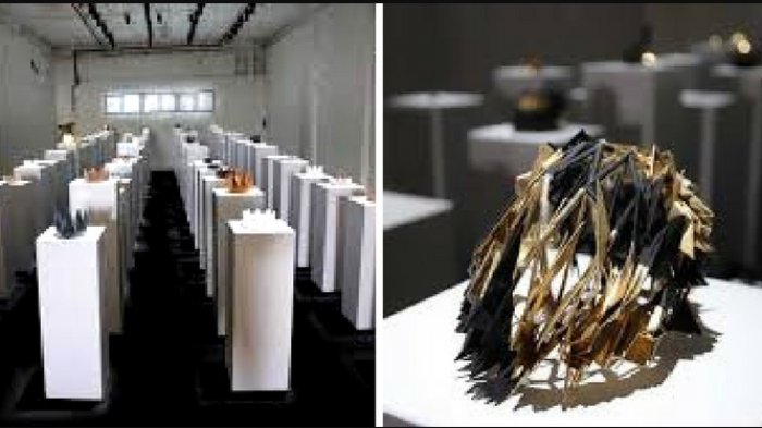 Beberapa maha karyanya ditempatkan di atas platform putih dengan tinggi bervariasi.