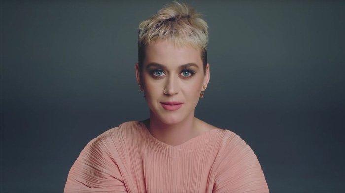 Katy Perry nampak berambut pendek dengan warna pirang.