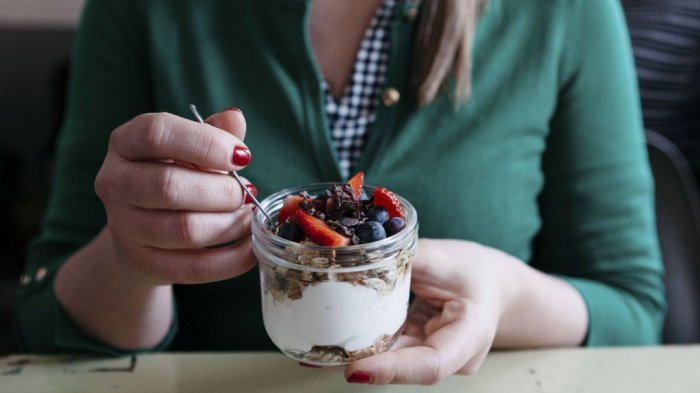 Sebaiknya, pilihlah yoghurt polos agar kita dapat menyajikan gula dengan takaran yang tepat.
