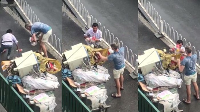 Pada video yang beredar menunjukan aksi turis berempati kepada pemulung.
