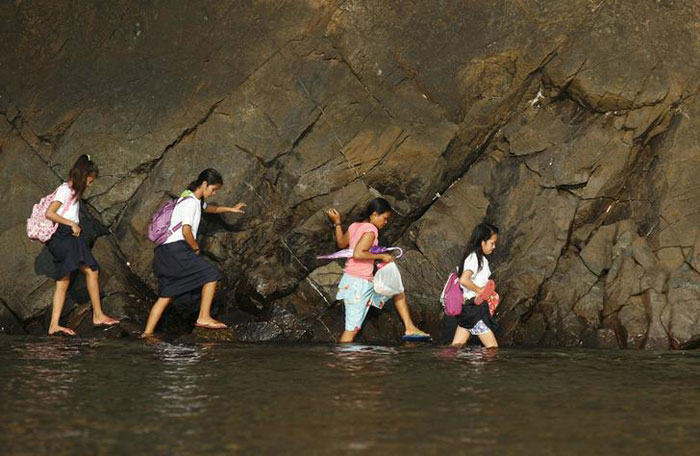 5. Para siswa ini mengenakan sepatu karet dan menggunakan kursi sebagai jembatan untuk sampai ke ruang kelas di Sitio Tapayan, Filipina.