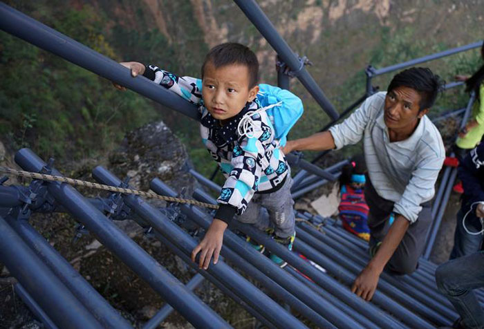 9. Siswa ini sedang berjalan di tepi tebing yang dibuat secara darurat untuk bisa sekolah.