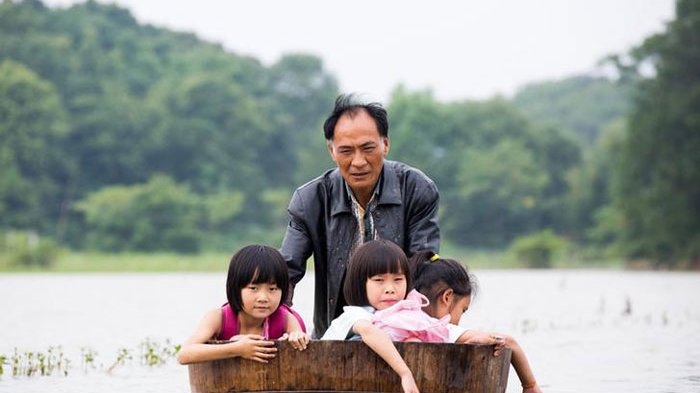 2. Seorang pria mendorong bak yang membawa anak-anaknya dalam perjalanan menuju sekolah di daerah banjir di Duchang, China.