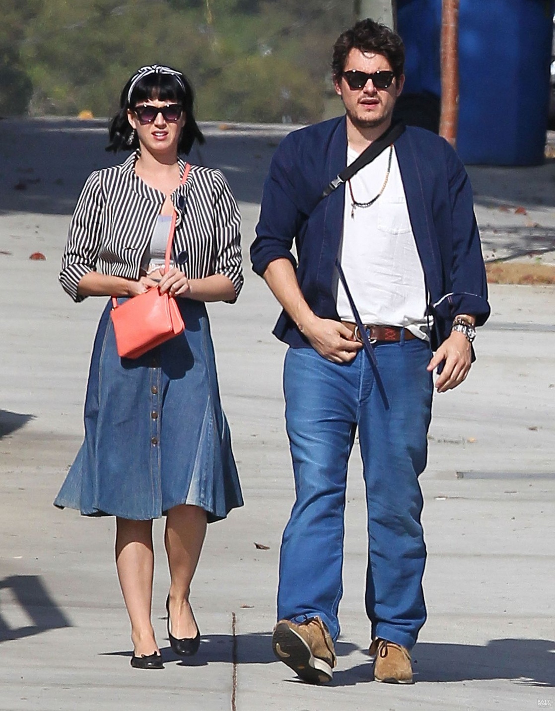 2. Katy Perry - Midi-length denim skirt styled dan striped cropped jacket.