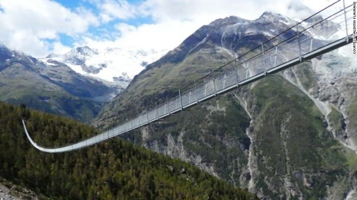Dengan panjang 494 meter dan tinggi 85 meter, jembatan gantung Charles Kuonen di Swiss ini disebut sebagai sebagai jembatan gantung pejalan kaki terpanjang di dunia.