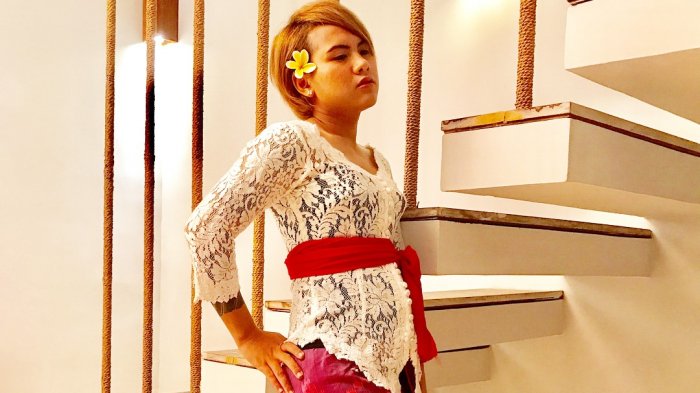 Tak lupa, ia juga mengenakan ikat pinggang warna merah khas Bali.