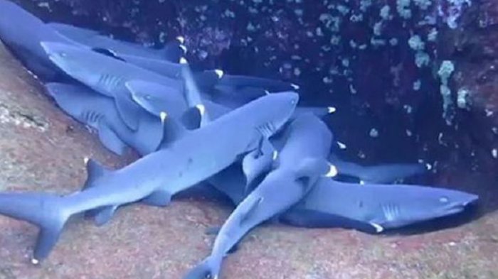 Tumpukan hiu besar itu kira-kira terdiri dari 20 hiu dan tidak terganggu oleh kehadiran manusia di dekatnya.