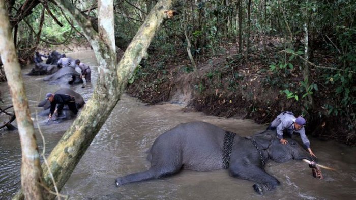 Para pawang meminta para gajah untuk merebahkan badan di sungai.