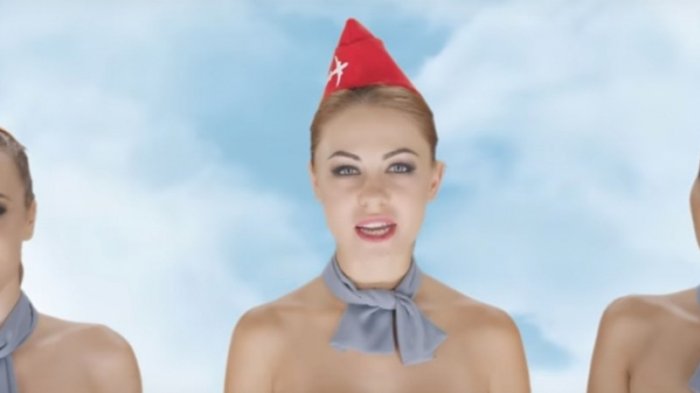 Iklan ini menampilkan beberapa awak kabin tanpa busana sambil menawarkan produk.