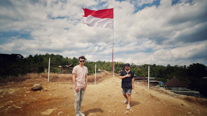 Dalam foto itu, terlihat dua personel Cash Cash Jean Paul Makhlouf dan Samuel Frisch berfoto dengan latar belakang bendara Merah Putih yang berkibar.
