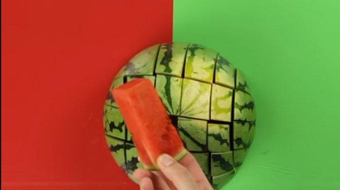 Coba potong dengan cara seperti gambar di bawah ini, maka kandungan air semangka yang kamu nikmati tidak akan mengotori bajumu.