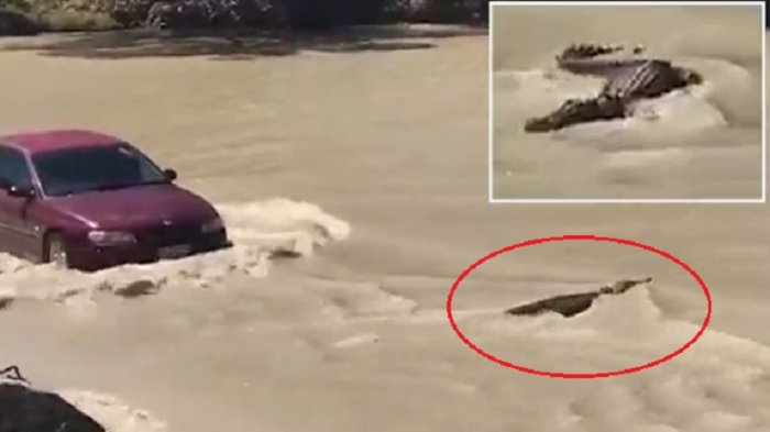 Di air keruh itu, terlihat seekor reptil besar yang bergerak di air mendekati kendaraan.