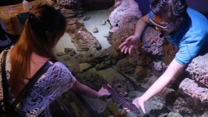 Pengunjung bisa memegang hiu, merasakan gelinya tentakel bintang laut, dan uniknya teripang di zona touch pool.