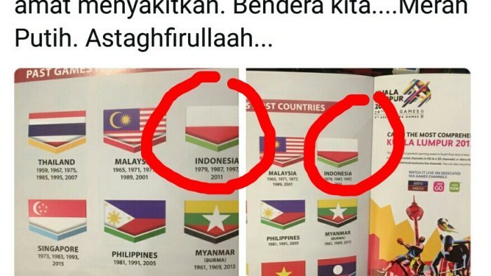 Melansir laman TribunStyle.com, pada buku panduan yang dibagikan kepada para tamu saat pembukaan SEA Games 2017 di Stadion Bukit Jalil, Kuala Lumpur, Malaysia, Sabtu (19/8/2017), tampak bendera Indonesia yang tercetak secara terbalik.