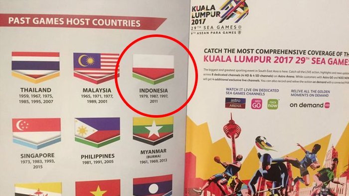 Kesalahan cetak warna bendera Indonesia ini terjadi di halaman ke-80 buku panduan SEA Games 2017 dan di Berita Harian keluaran Malaysia.