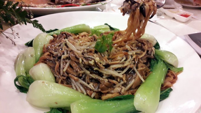 Ada olahan mi ada braised eefu noodles with shredded abolone, shredded mushroom and anoki mushroom.