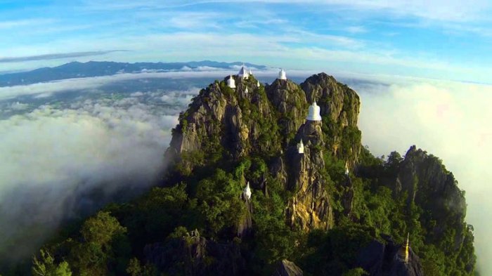 Puncak-puncak yang dipenuhi oleh candi-candi berwarba putih ini diyakini sebagai jejak Buddha.