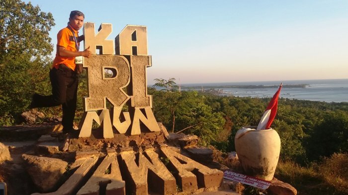 Monumen berbentuk tulisan KARIMUNJAWA di sisi timur puncak tak pernah sepi diduduki turis yang ingin berswafoto dengan latar pemandangan laut.
