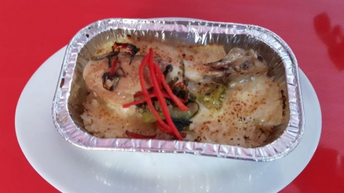 Ayam ini disajikan dengan alumunium foil dan onigiri.