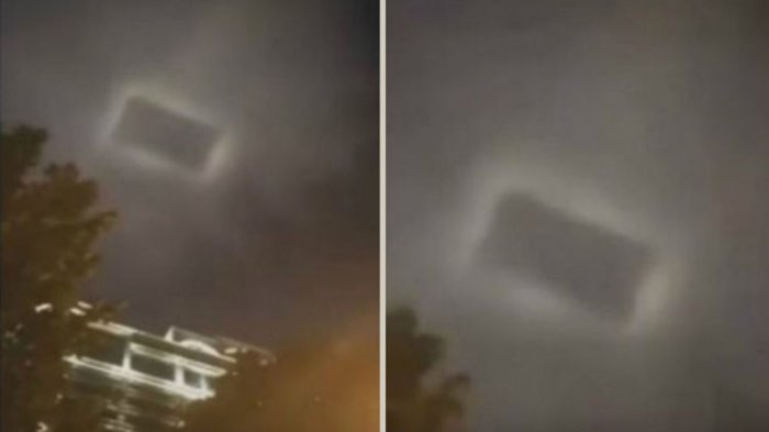 Dalam sebuah video yang diunggah di Youtube, tampak sesuatu yang berbentuk persegi panjang muncul di langit mendung di atas Kota Jinan, Provinsi Shandong, China.