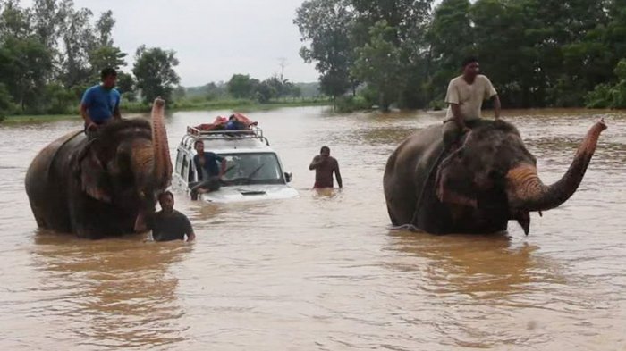 Gajah-gajah dari Taman Nasional Chitwan pun dikerahkan oleh para pawangnya untuk mengevakuasi korban banjir di Nepal melintasi genangan air dalam yang sedang mengalir deras.