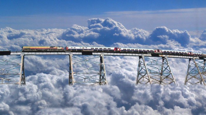 Bayangkan saja, ada jalur kereta yang melintasi tebing curam, lautan sampai awan.