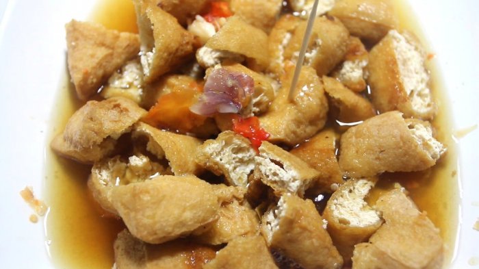 Berbahan dasar tahu goreng, tahu gejrot disajikan dengan cabai, bawang merah, bawang putih, dan kuah yang terbuat dari kecap dan gula aren