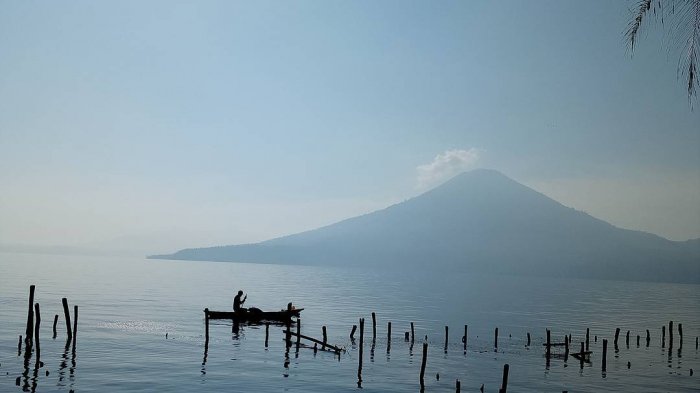 Dari Kota Batu, naik perahu motor dari pinggir Danau Ranau ke arah sumber air panas di kaki Gunung Seminung.