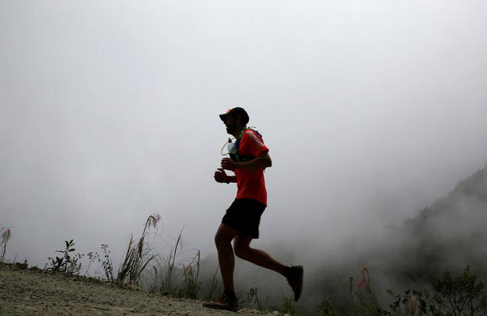 7. Seorang peserta kompetisi Skyrace berjalan tengah berlari diantara kabut.