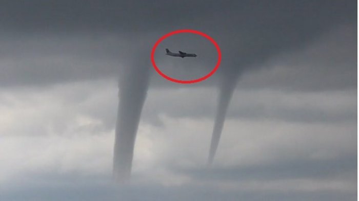 Terlihat pesawat tersebut nekat menerobos tiga angin tornado sekaligus.