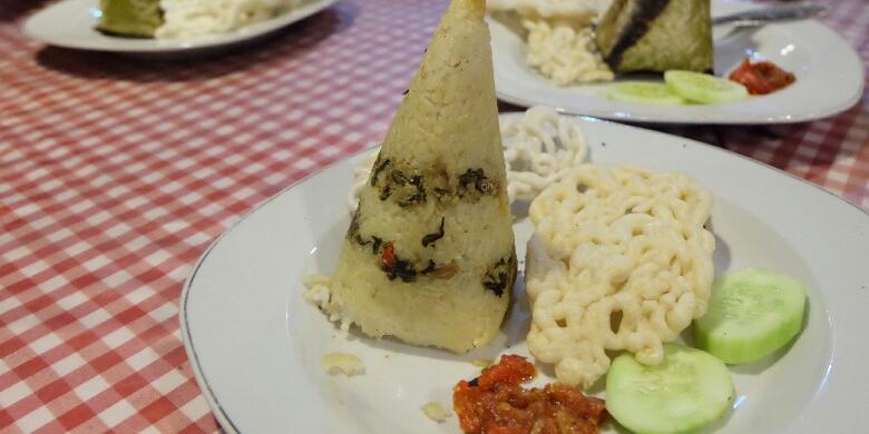 Kemudian nasi ini dibentuk kerucut mirip tumpeng kecil dan diberi isian ayam, daun singkong, teri, dan daun kemangi.