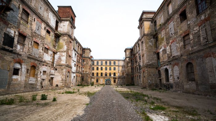 Terdapat gedung besar yang kini tak berpenghuni dan terlihat tak terawat.