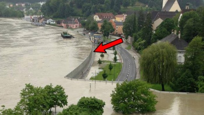 Pada bulan Juni 2013, dinding penahan banjir yang spektakuler ini jadi populer karena sangat efektif.