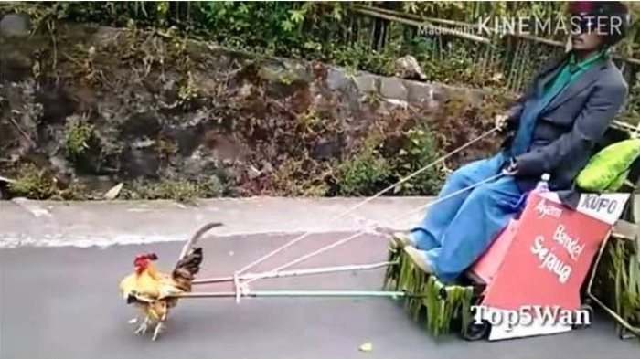 Padahal, ketika melaju, ayam itu diangkat sedikit oleh pria yang ada di gerobak.