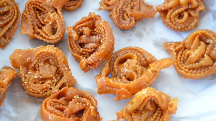 Dimasak dengan cara digoreng, chebakia diberi topping madu.