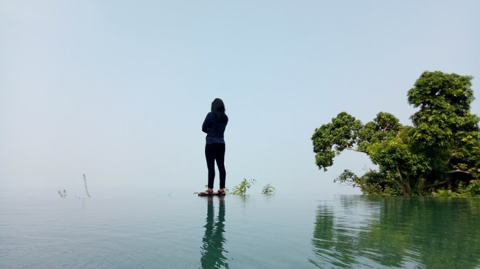 Wisatawan biasanya berfoto di atas kolah sehingga memunculkan effek bak berdiri di atas permukaan air.
