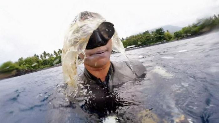 Dia merasa ngeri berenang melewati tumpukan sampah itu.