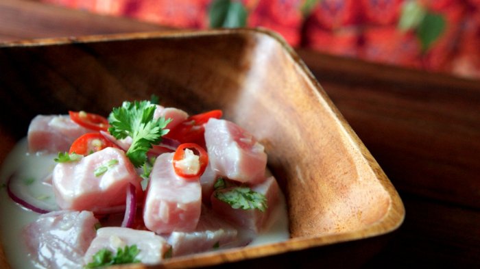 Kinilaw terbuat dari potongan ikan segar, bawang merah, bawang putih, jahe, tomat, dan cabai.