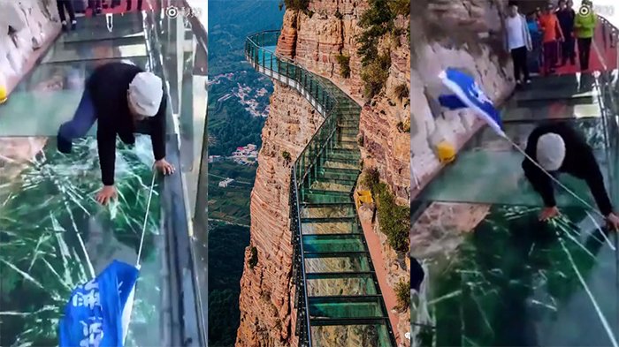 Sebuah video telah diunggah ke internet dan menunjukkan seorang pemandu wisata berjalan di jembatan East Taiheng Glasswalk.