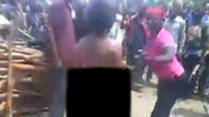 Seorang perempuan yang memakai bandana, yang tidak lain adalah anggota dari gerakan Kamuina Nsapu - kelompok yang menentang pemerintah - mencambuk perempuan itu dan anak muda yang berhubungan seks dengannya.