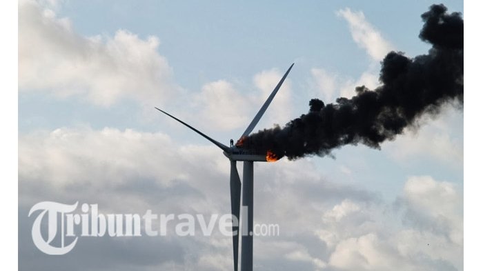 Dalam kejadian malang ini, terlihat bagaimana turbin angin sempat terbakar sementara dua teknisi sedang mengerjakannya.