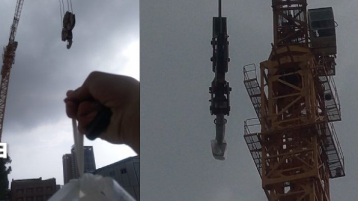 Bukannya turun dari crane, si pekerja konstruksi tersebut malah menurunkan kait crane.