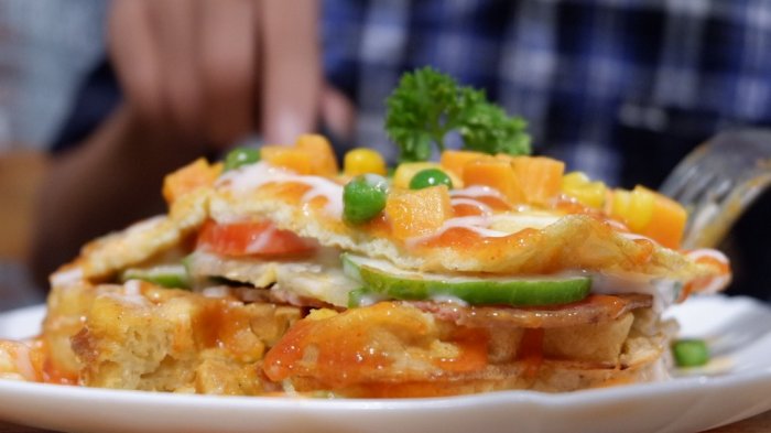 "Kalo pake roti itu sudah biasa, kita pake varian beda dengan rasa waffle yang lebih gurih. Jika biasanya waffle manis ini kita bikin gurih dan asin supaya sepadan dengan varian topingnya, " ujar Anggi owner Candu Cafe