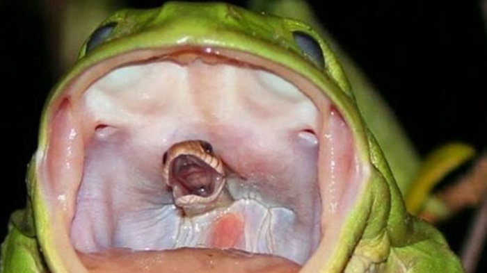 Mungkin satu-satunya yang terlihat adalah bagaimana ular mencoba ke luar dari mulut katak.