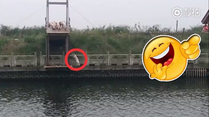 Menurut Shanghaiist, petani tersebut mengembalakan babi-babinya yang gemuk ke papan selam dengan tongkat.
