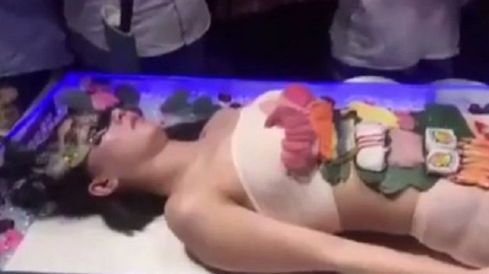 Lantas orang-orang mengelilinginya dan mulai mengambil sushi di atas tubuh wanita.