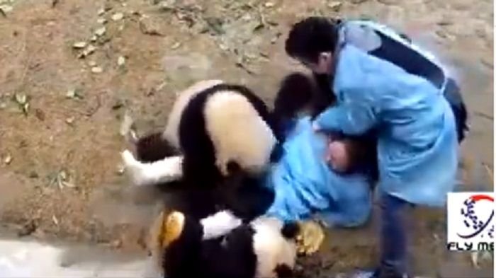 Dikira sedang bermain, nyatanya ke 3 ekor panda itu menyaerang perempuan petugas kebun binatang tersebut.