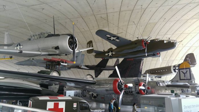 Pesawat yang pertama, Wright Flyer, dibuat oleh Wright Brothers, dan modul perintah Appolo 11 Colombia adalah daya tarik utama di museum ini.
